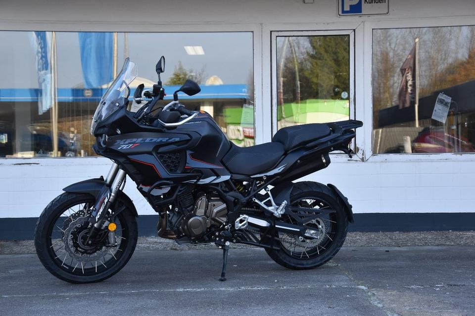Alle Fahrzeuge stehen in Bad Oldesloe Hamburger Str. 119-121 Xplora 707 Engine new! Twin-cylinder, 4-stroke, 554 cc IE, 8V 70,5 x 71 mm. 47HP / 51Nm 6-speed manual gearbox Liquid cooling Twin-cylinder, 4-stroke, 698 cc IE, 8V 83 x 64,52 mm. 70HP / 70Nm 6-speed manual gearbox Liquid cooling High-strength steel multitubular frame KYB upside-down fork ø43mm. Progressive KYB shock absorber adjustable in preload Cast aluminum RIM; 120/70-17" oR cross-spoked rim. 110/80-19" ABS and TCS; BREMBO (Xplora 707) double-piston calipers; dual floating discs Ø320mm. ABS and TCS; BREMBO (Xplora 707) single-piston caliper; floating disc Ø260mm. Sitzhöhe 795 mm Dry Weight 221 kg Fuel Tank Capacity 19,5L Preis: 7.390,-€ zuzüglich 250,-€ Liefernebenkosten Fahrzeug ist am Lager und Lieferbar